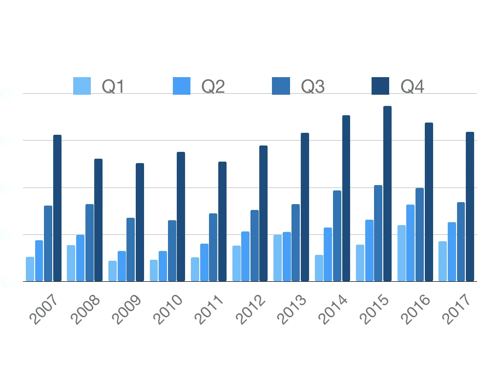 From this graph, we can discern some patterns. We know Q4 sales are consistently higher than the others. And we know that Q1 sales are normally the lowest at approximately 75% of the prior Q4. We can also see that the sales from the prior quarter is often not a good indicator of what the next quarter’s sales will be. Sure, we can look at the long history and determine average percentages and apply that to get a fairly good guess. But we need the long history. Looking at only the prior quarter’s sales is insufficient for determining the next quarter’s sales.